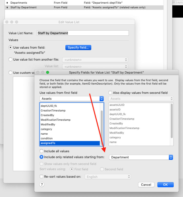 One could start with just Department and Assets tables, setting it such that Assets is the "Child" of Department (i.e. one department can have many assets); adding a portal to assets and enter assets. If each asset is assigned to a staff member within the Department, one could then create a Report to display what is under each department and each employee withing the department. Does that make sense? A portal isn't going work in this setting, but a Report using a sub-summary part will do nicely.
